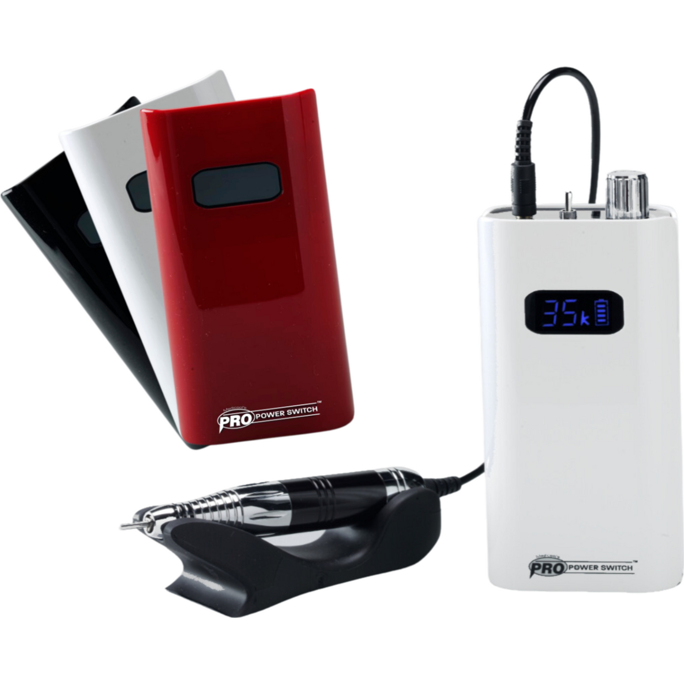 Includes three different snap-on color case options (RED, White & Black) that you can switch to match your style. Show off your creativity with the Pro Power SWITCH! The Pro Power SWITCH is a professional and rechargeable manicure-pedicure filing system. Its cordless, rechargeable design allows for convenient portability, making it a versatile filing system for any workstation, or it clips conveniently to your belt or pocket, allowing freedom of movement. 35,000 RPM Brushless Motor Portable/Rechargeable Up to 10 hours of battery life 2 Hour Quick Battery Charge Variable speed control Includes Carrying Clip & Desktop Handpiece Cradle Forward & Reverse...