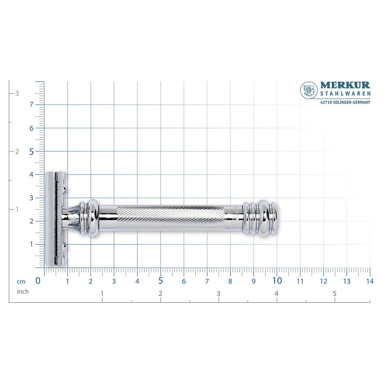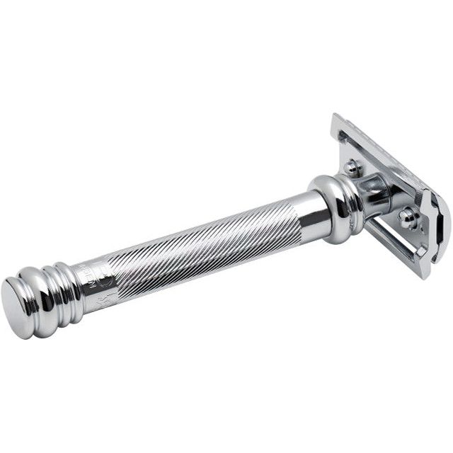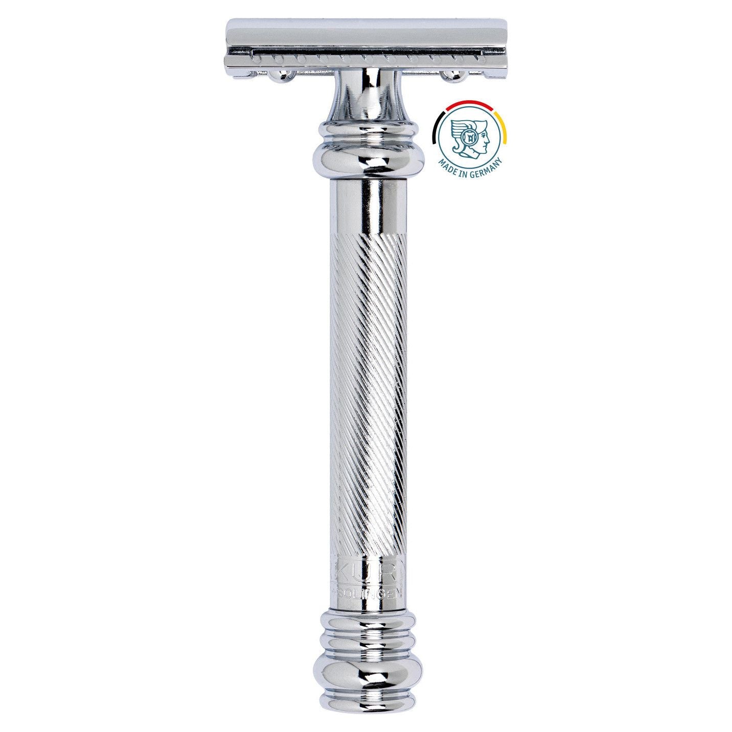 The 38C razor is one of Merkur's heavyweights in the range. Long-time fans also call him MERKUR Barber Pole. It owes its nickname to the characteristic shape of its fluted handle, which was designed based on a Barber Pole. With its non-slip grip, it offers you a firm hold and thanks to its high weight, every move is made with stoic calm. It's a heavy duty razor, made to handle your beard.