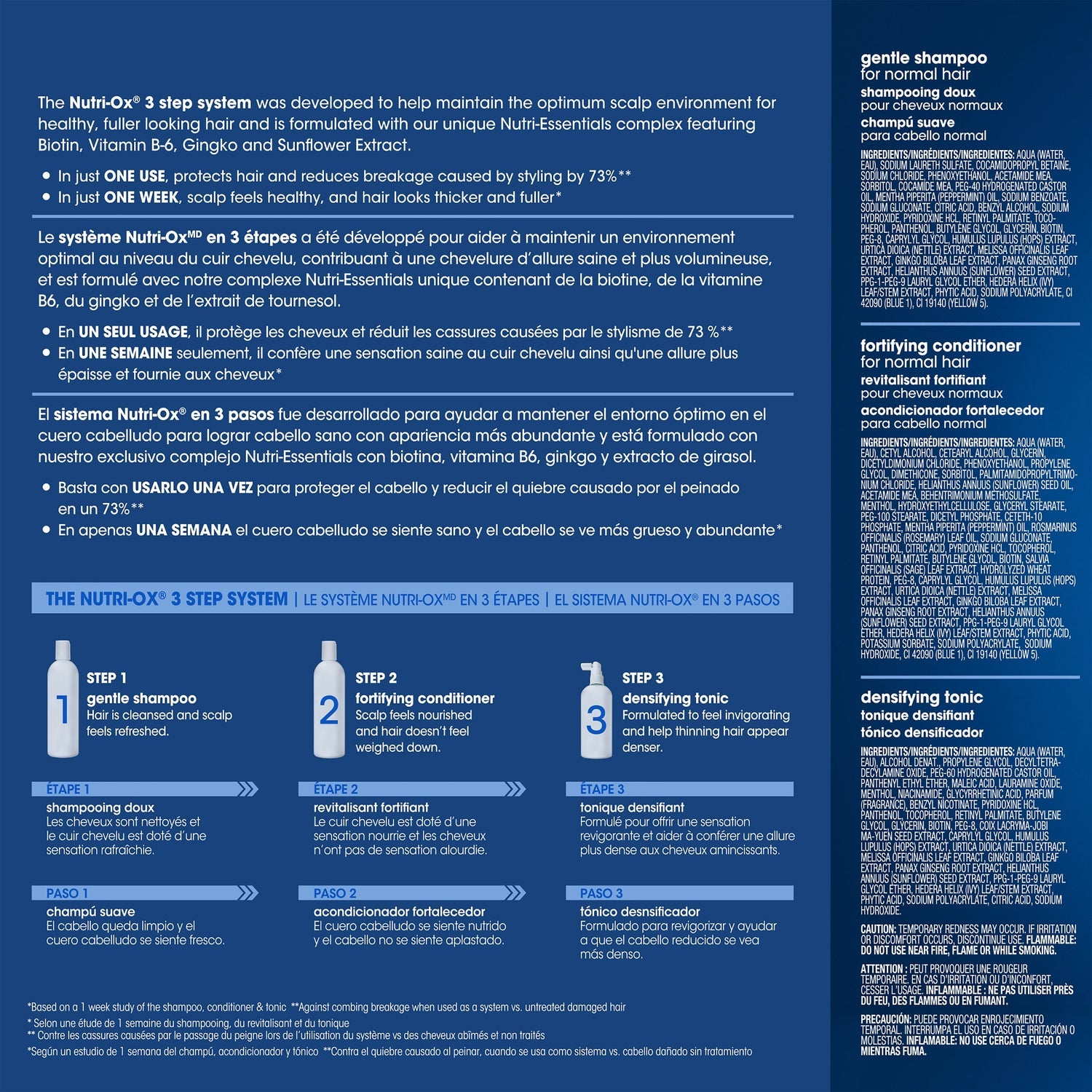 3. Dry hair and spray Densifying Tonic 10 times directly to dry scalp. Use twice daily, 12 hours apart. Massage in. Do not rinse.Step 1 – Nutri-Ox Gentle Shampoo Normal