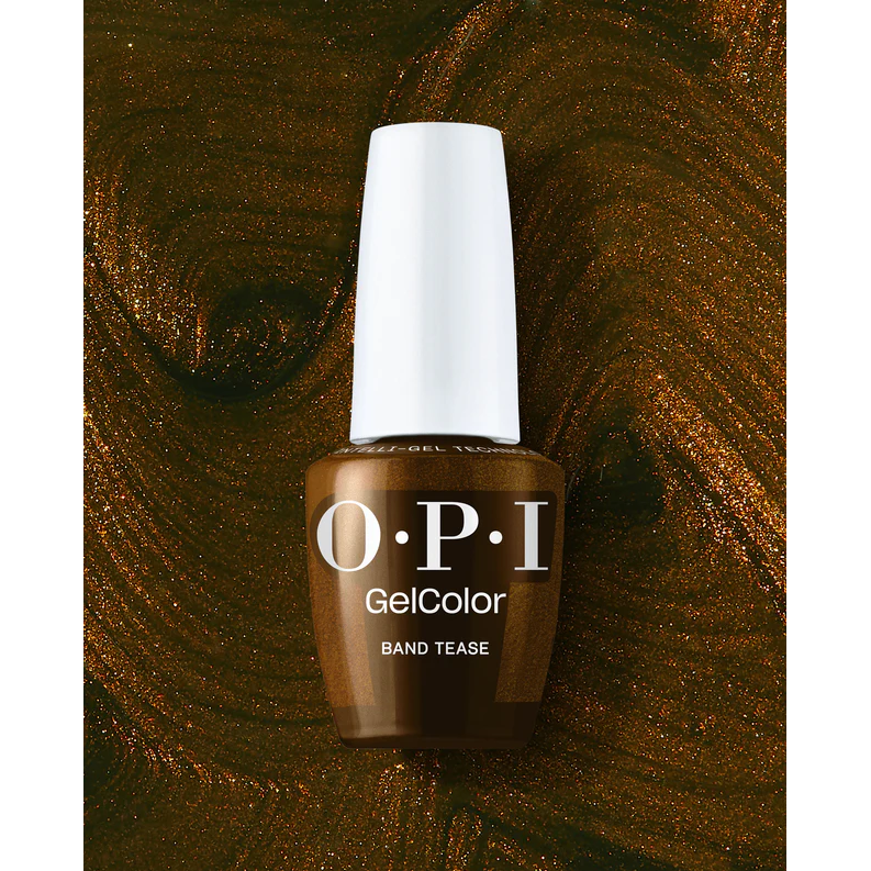 A semi-sheer dark brown metallic gel nail polish that's with the band.