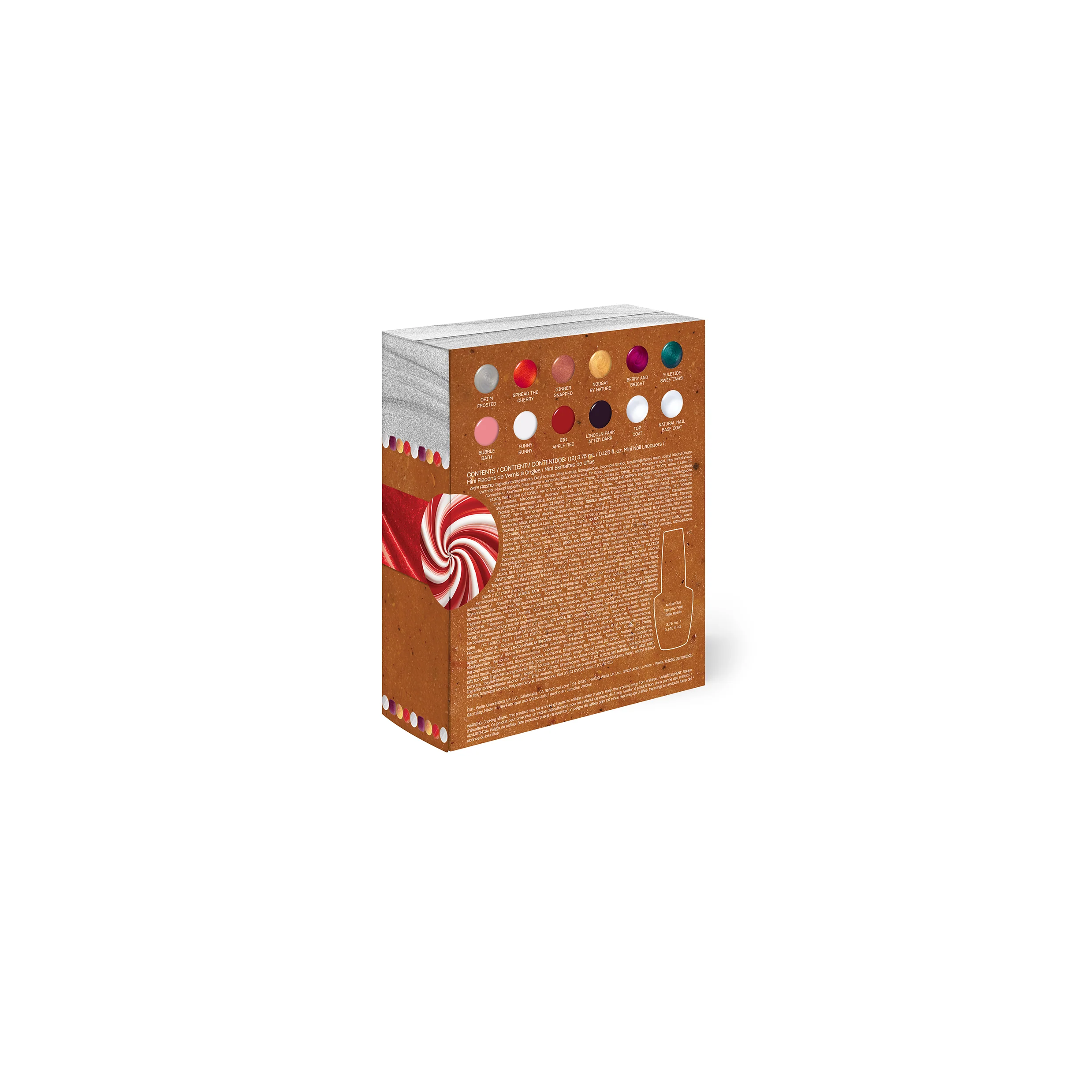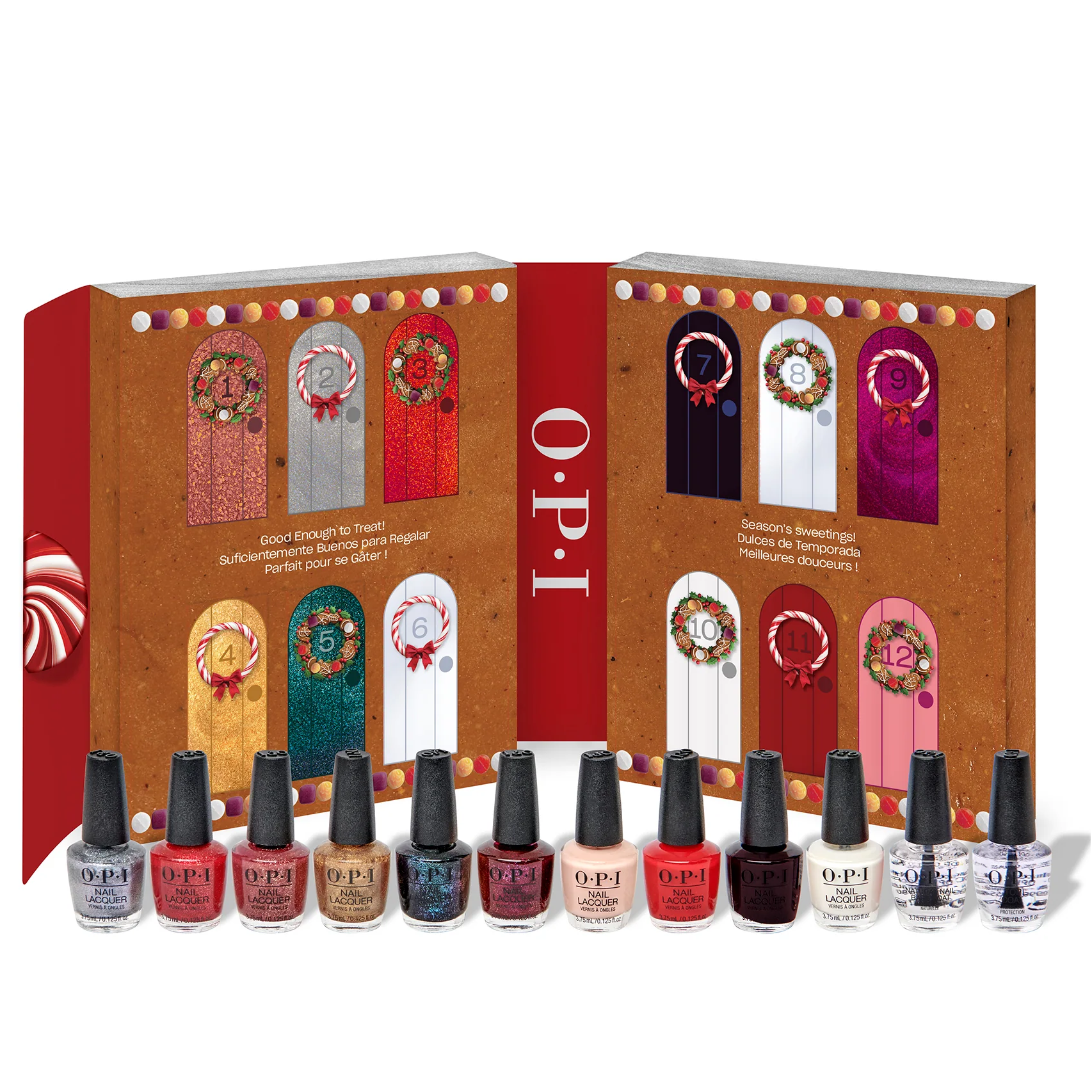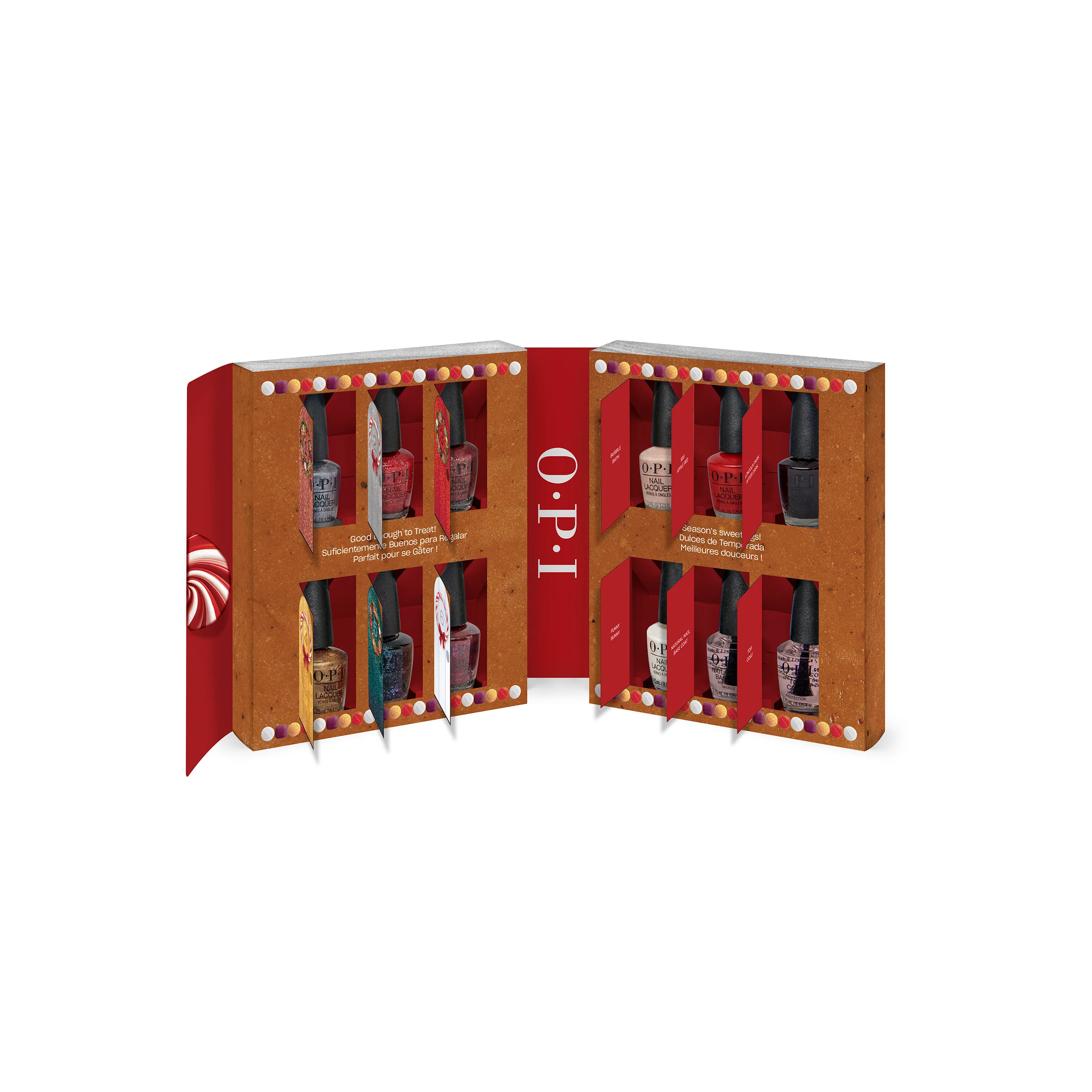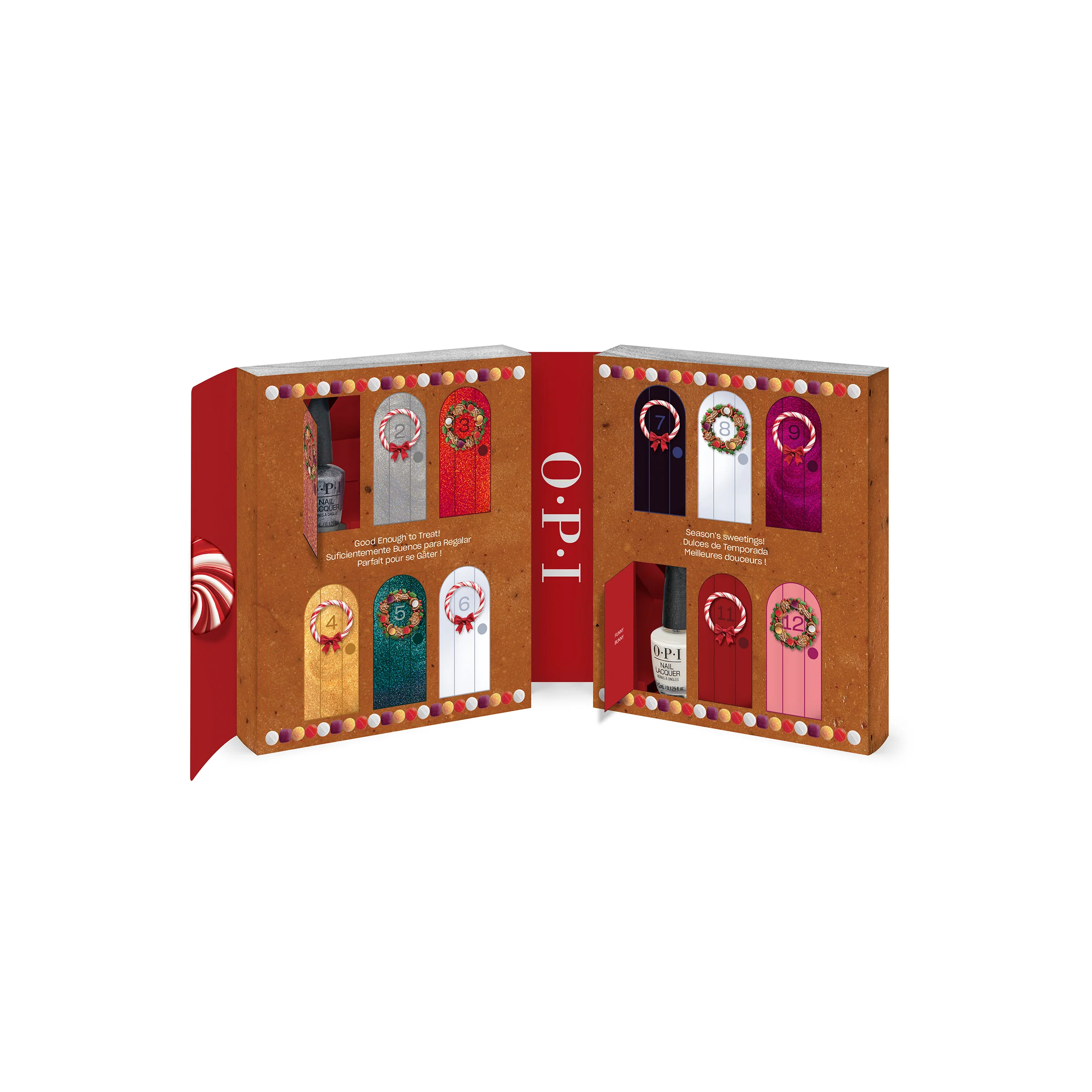 Welcome to the House of OPI! Take a stroll down candy lane to celebrate the 12 days of candymas. Our decadent advent calendar features mini (but majorly sweet) Nail Lacquers behind every door including: 6 limited edition shades from our Holiday collection: OPI'm Frosted, Spread the Cherry, Ginger Snapped, Nougat by Nature, Berry and Bright, Yule-tide Sweetings! 4 iconic shades: Funny Bunny™, Bubble Bath™, Big Apple Red™, Lincoln Park After Dark™ 1 Natural Nail Base Coat 1 Top Coat