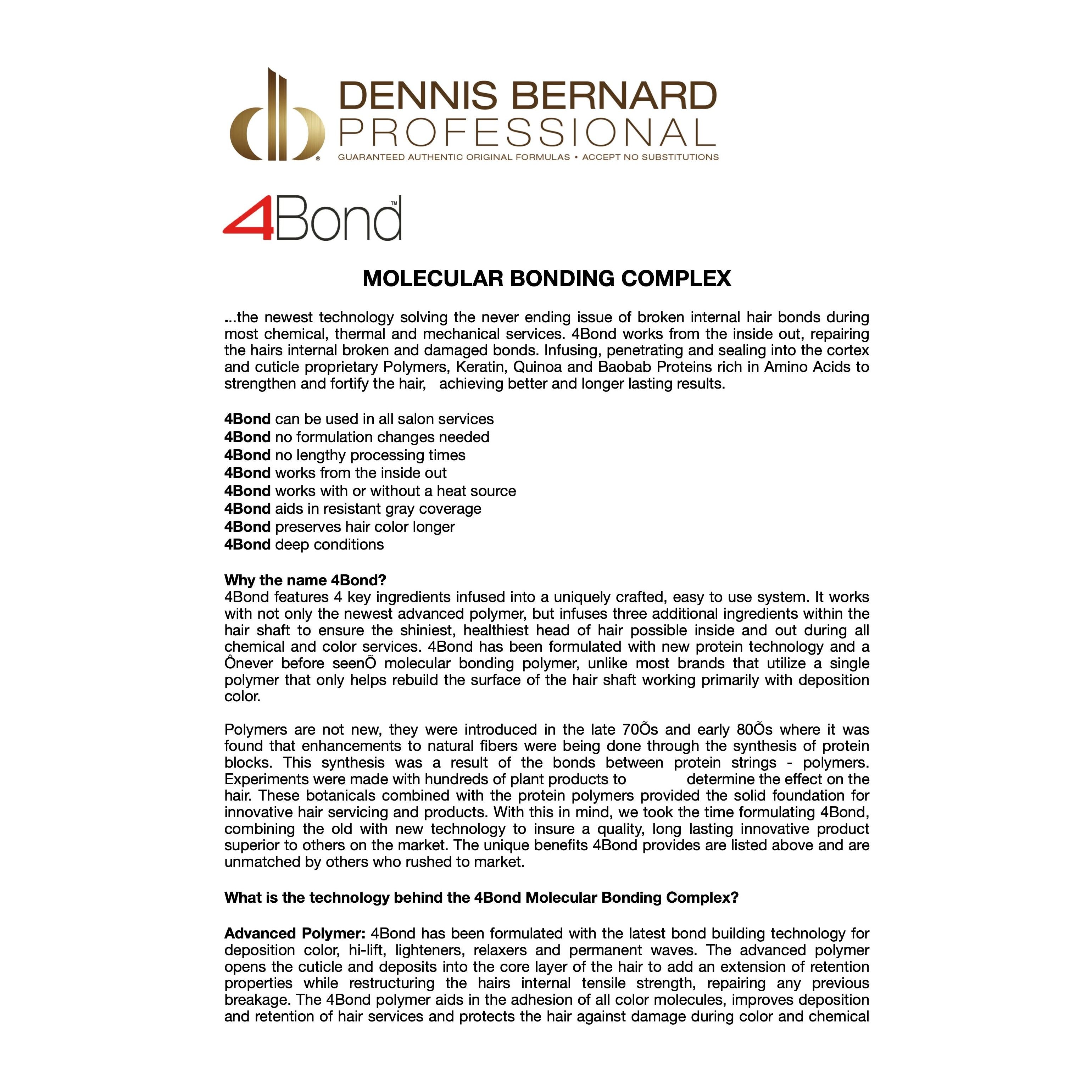 Molecular Bonding Complex (MBC), is the most exciting and advanced innovation in polymer technology & treatment for damaged hair. MBC works from the inside out repairing the hairs internal broken and damaged bonds. Infusing, penetrating and sealing into the cortex and cuticle proprietary polymers, keratin, quinoa, and baobab proteins rich in amino acids to strengthen and fortify the hair, achieving better and longer lasting results. MBC is and easy at home treatment for damaged hair with a variety of applications. From lightening and color touch ups to just simple stand alone treatment. Dennis Bernard’s Molecular Bonding Complex is a true innovation to repair and treat damaged hair