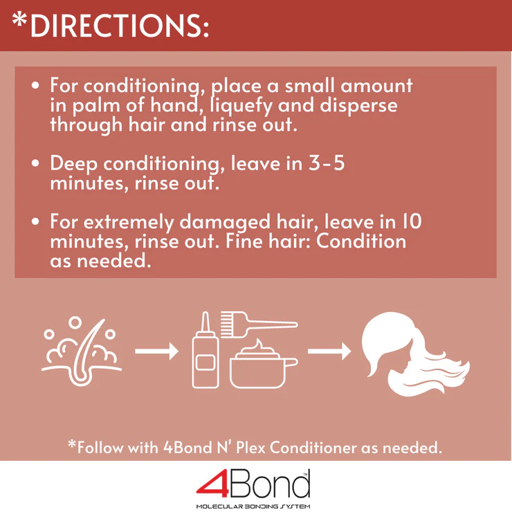 4BOND N’ PLEX is a rich, thick, creamy color hold paraben free bond building Conditioner. Using 4BOND N’ PLEX Shampoo & Conditioner (pH 4.5) AFTER color/chemical services will rebuild hair bonds and fortify highly damaged, dry & thirsty parts of the hair shaft. 4BOND N’ PLEX Shampoo & Conditioner has been developed to maintain the health of the hair bonds previously damaged by a color/chemical service. With continued at home use, 4BOND N’ PLEX provides luxurious, soft and shiny hair while maintaining and preparing the hair’s health for it’s next color/chemical service.
