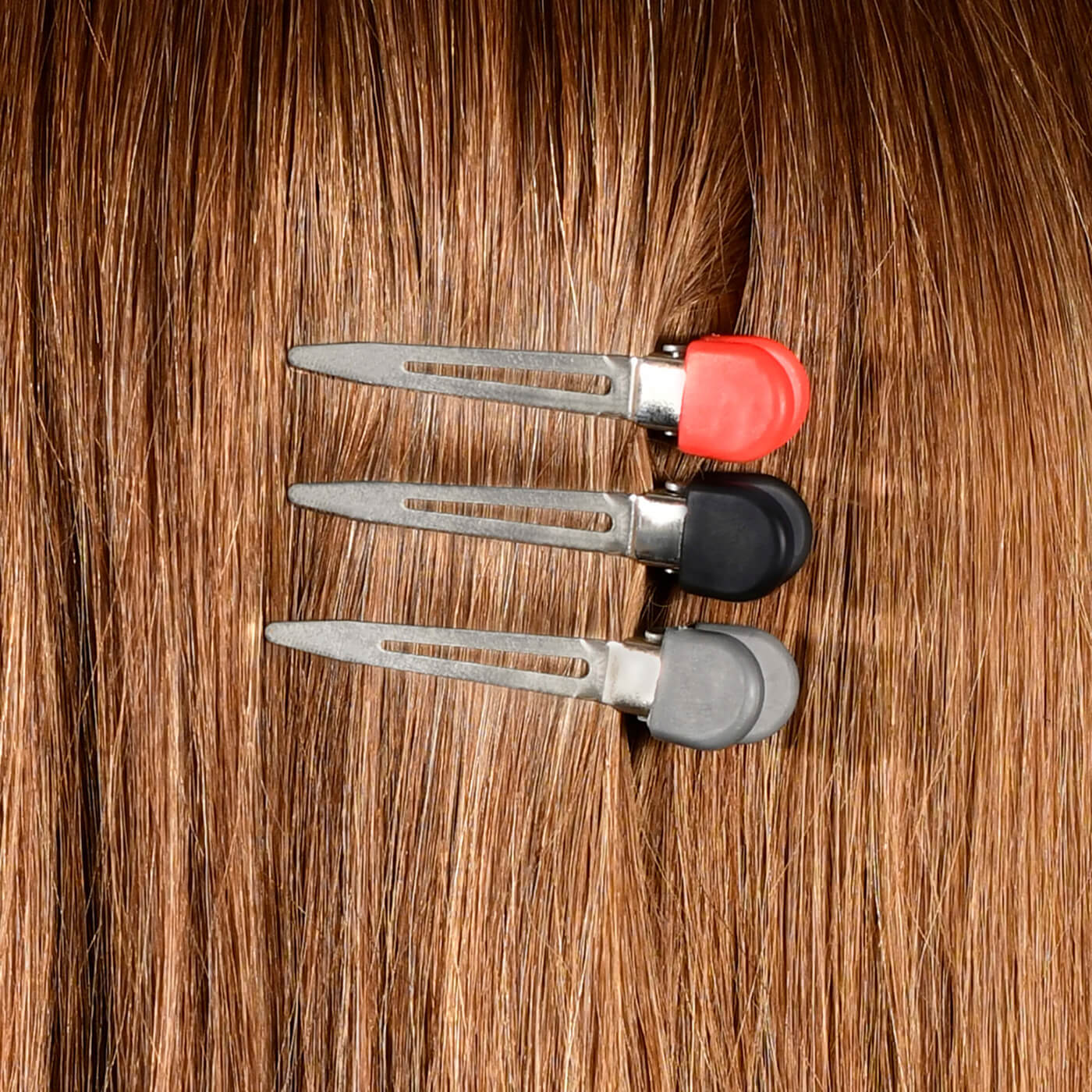 Super lightweight clips have a firm grip and secure tightly to balayage film without weighing it down. Great for sectioning and securing hair. Small, single-prong design is 2" in length and features rubberized pads that are easy to grip, even with gloves on. Includes 15 clips in red, silver, and black.