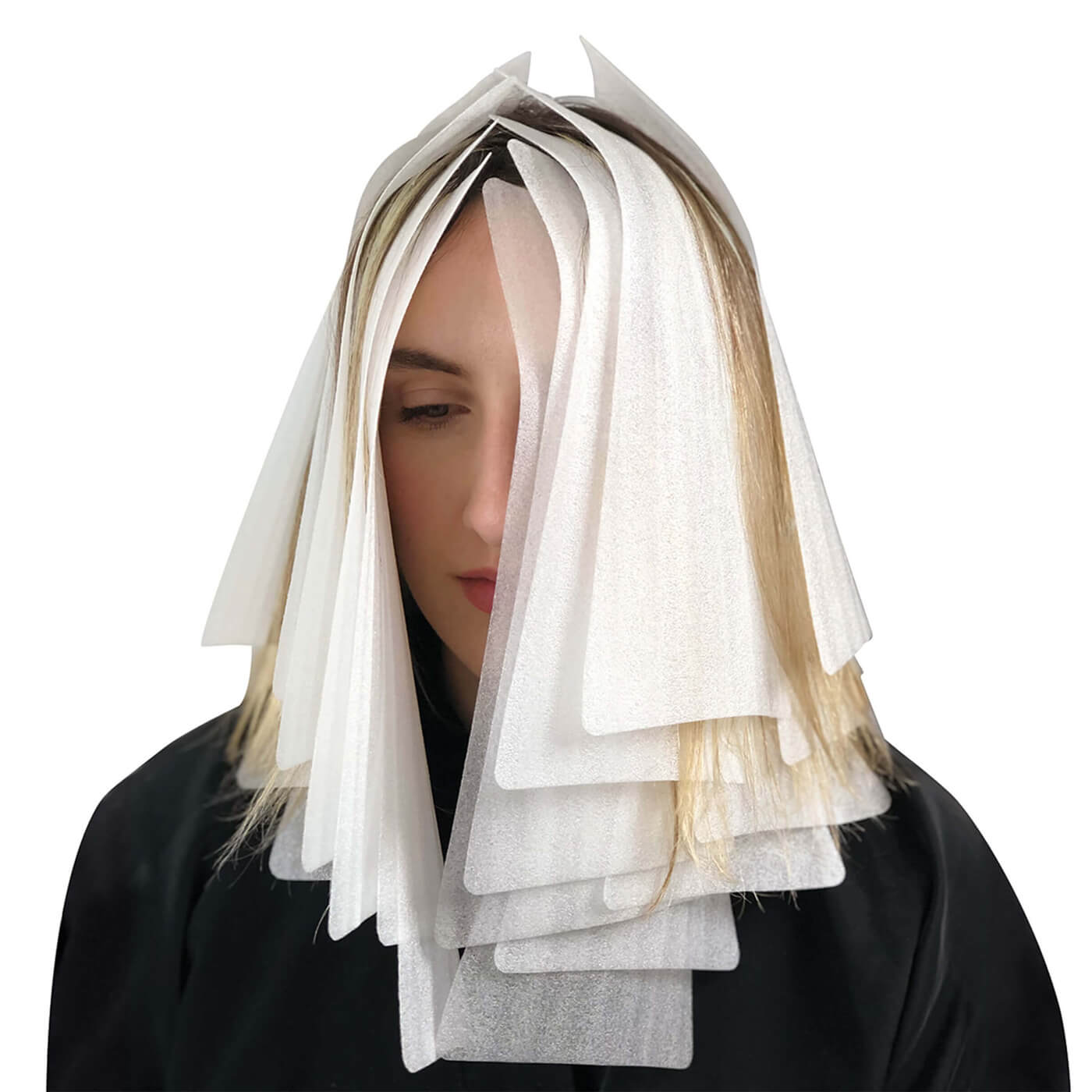 A lightweight foil alternative that is perfect for balayage, color blocking, and freehand techniques. Flexible foam material contours to the shape of the head and each sheet has a wide surface that is ideal for freehand color techniques or color correction processes. The translucent sheets allow you to monitor the lightening process conveniently, and they are washable and reusable for numerous services.