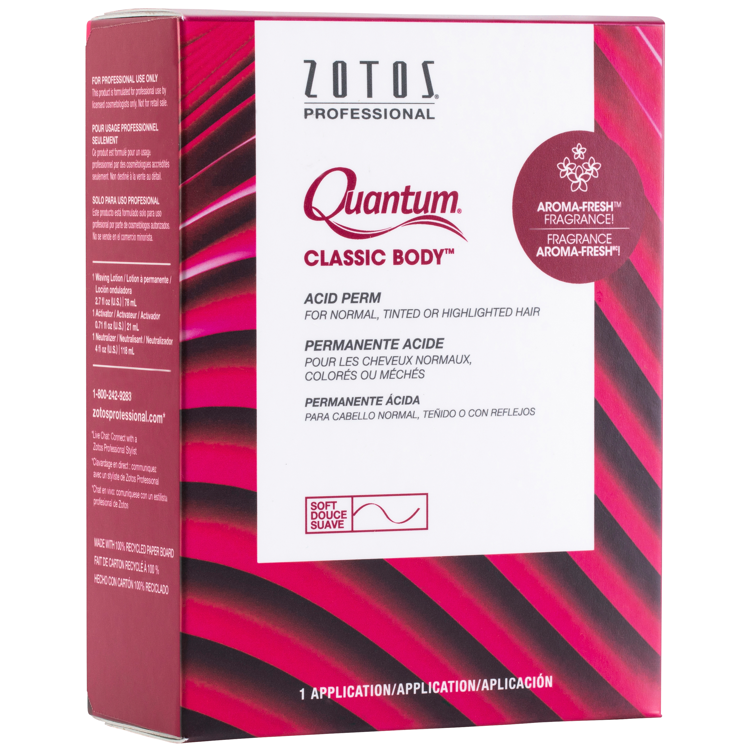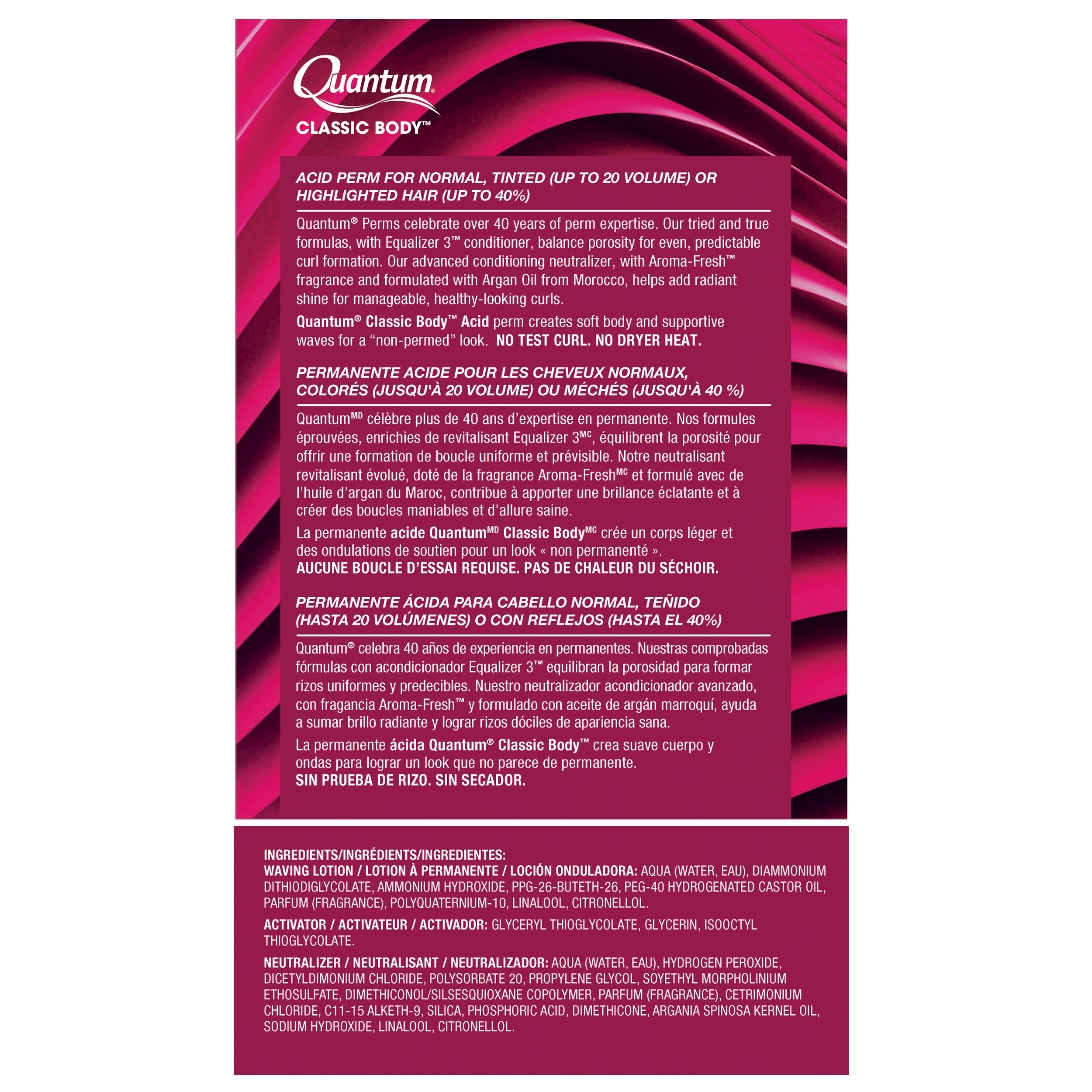 Quantum Classic Body with Aroma-Fresh™ Fragrance An acid perm that creates soft, supportive body and supportive waves for a “non-permed” look. No test curl. No dryer heat required. Our tried and true formulas contain Equalizer 3™ conditioner to balance porosity for even, predictable curl formation. Our advanced conditioning neutralizer, with Aroma-Fresh™ fragrance and formulated with Argan Oil from Morocco, helps add radiant shine for manageable, healthy-looking curls.What Makes it Special: Waving Lotion with Equalizer 3™ Conditioner + Advanced Conditioning Neutralizer with Aroma-Fresh™ Fragranc (Formulated with Argan Oil from Morocco).Quantum® Classic Body (Acid Perm):• Curl Type: Soft Waves• Hair Type: Normal, Tinted &...