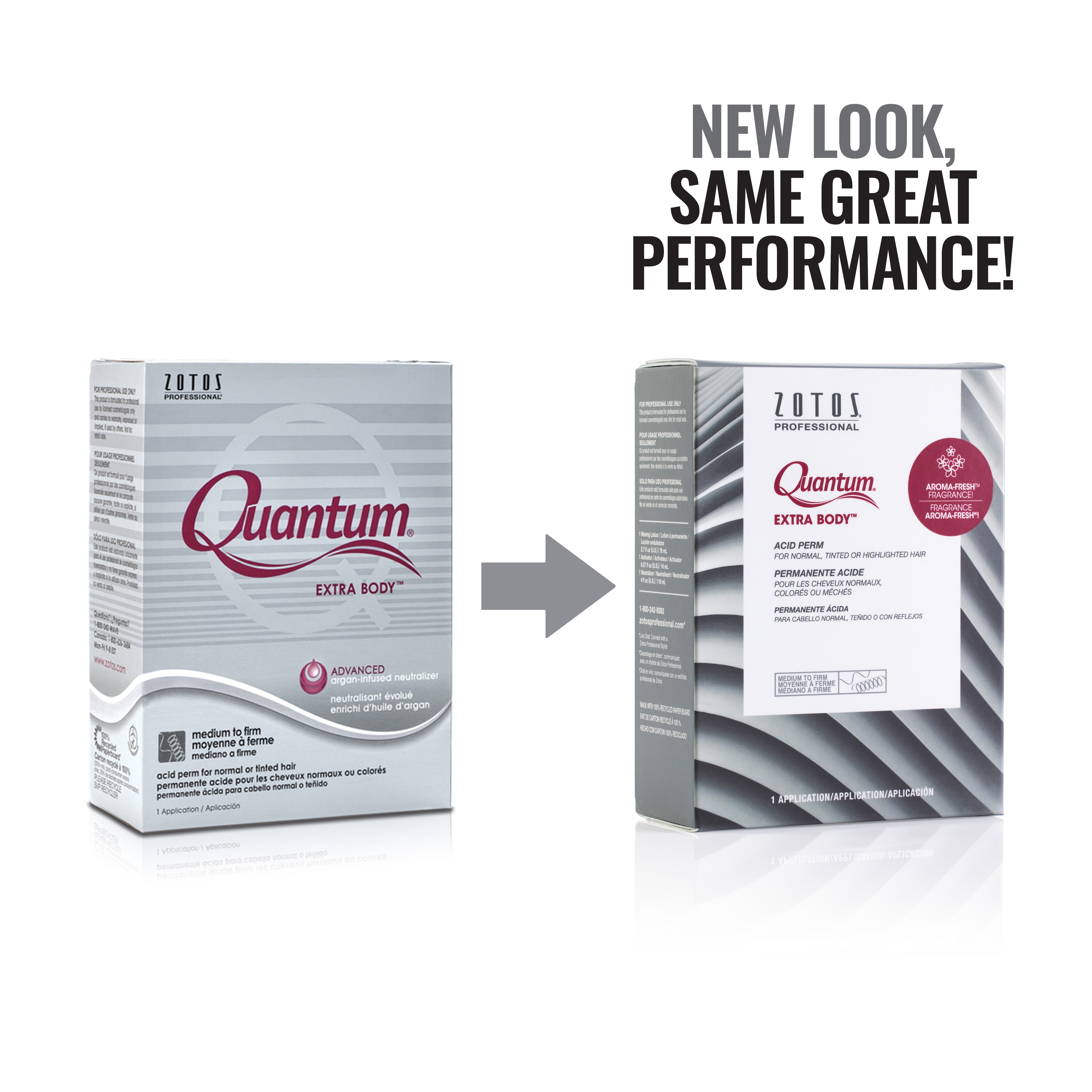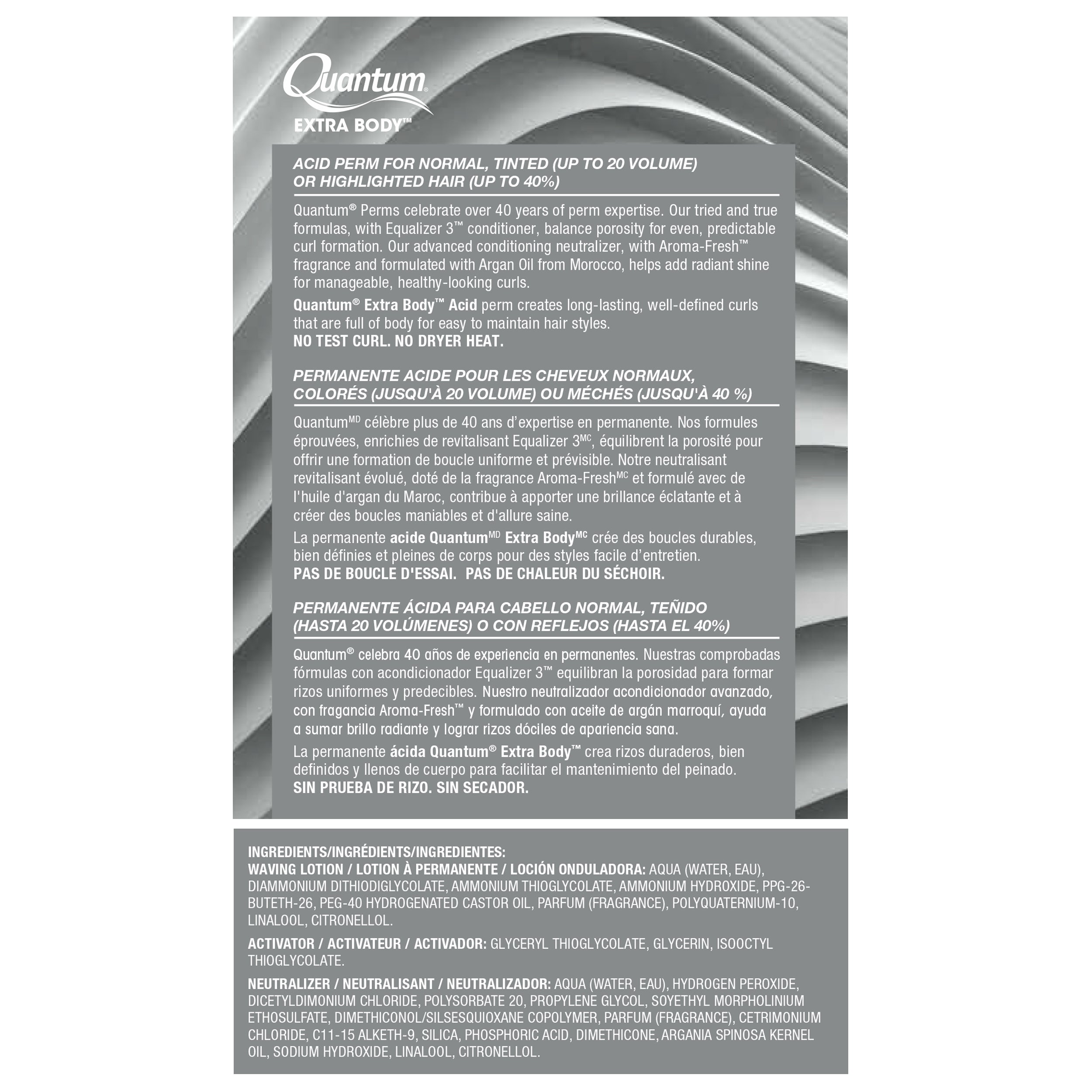 Quantum Extra Body perm creates long lasting, well-defined curls that are full of body for easy to maintain hair styles. No test curl. No dryer heat required. FOR NORMAL OR TINTED (UP TO 20 VOLUME) HAIR Our tried and true formulas contain Equalizer 3™ conditioner to balance porosity for even, predictable curl formation. Our advanced conditioning neutralizer, with Aroma-Fresh™ fragrance and formulated with Argan Oil from Morocco, helps add radiant shine for manageable, healthy-looking curls.What Makes it Special: Waving Lotion with Equalizer 3™ Conditioner + Advanced Conditioning Neutralizer with Aroma-Fresh™ Fragranc (Formulated with Argan Oil from Morocco). Quantum® Extra Body...