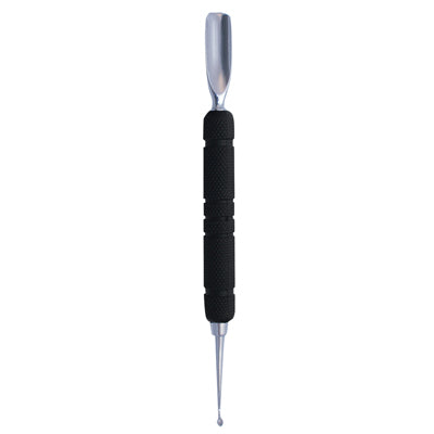 Superior-quality 100% stainless steel tools featuring a rubber grip handle that provides control and comfort. Curved end shapes the cuticle; won't scratch nail. Spoon end cleans underneath nails.