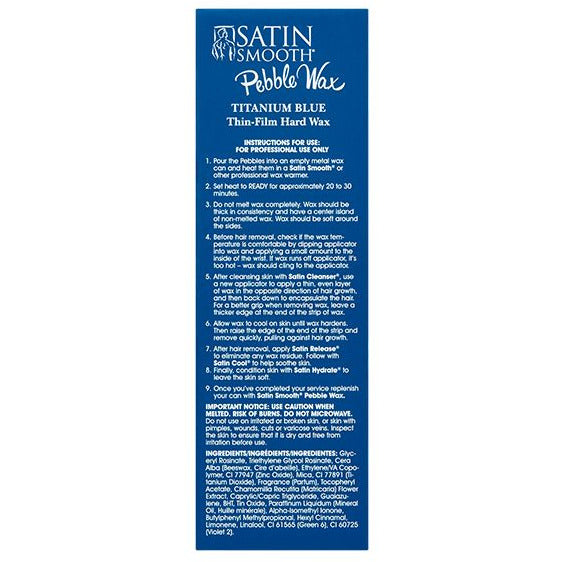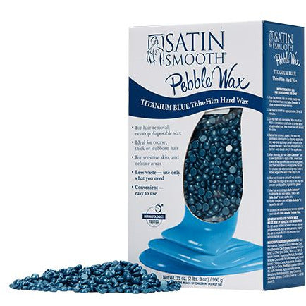 Convenient, customized service. Satin Smooth® Titanium Blue Thin Film Pebble Wax is a pourable formula of our traditional thin film wax, with the same incredible results. Just pour what you need into your warmer and the pebbles melt into the smooth, creamy texture. For hair removal; no-strip disposable wax; ideal for coarse, thick, stubborn hair. Recommended for sensitive skin and delicate areas.
