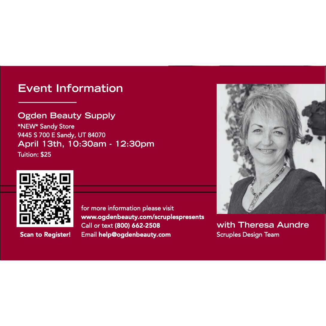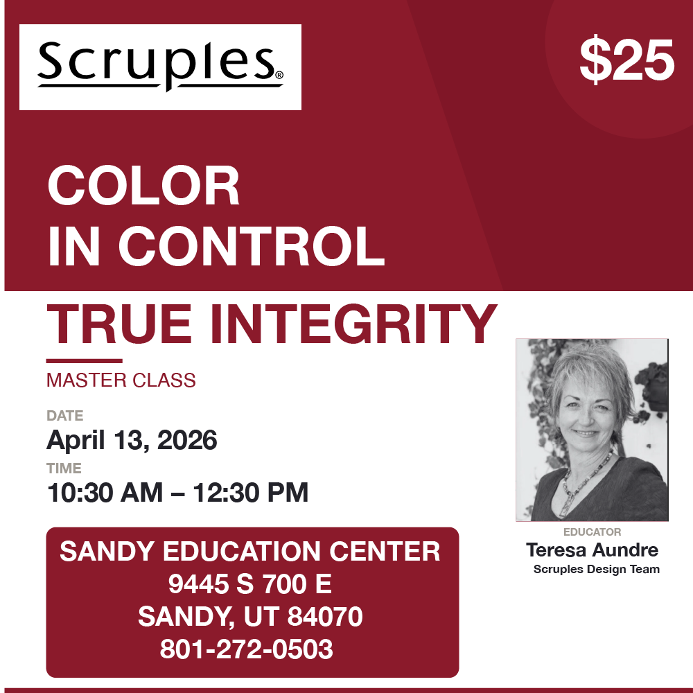 Scruples True Integrity Color In Control Master Class Join Theresa Aundre with the Scruples Design Team for an educational experience focused on mastering color services using the Illusionist color system. Learn effective formulation and application techniques to create beautiful tone, controlled results, and confident color work behind the chair. Discover how and when to use Power Blonde to achieve reliable lift and brightness. Explore best practices for blonde services, including proper product selection and application, to deliver consistent, high-performance results for every client. Event Information: Location: OBS Sandy Store9445 S 700 E Sandy, UT 84070 April 13th, 10:30am - 12:30pm...
