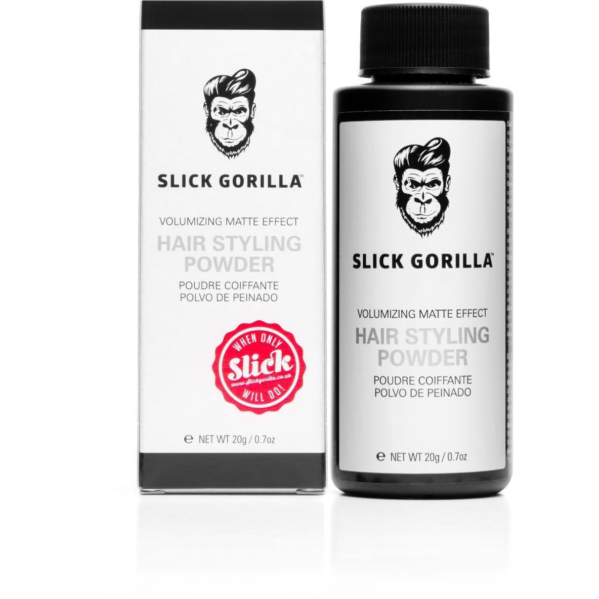 Slick Gorilla hair styling powder changed the styling game forever and for those reasons it's our best selling product. Natural look Gravity defying lift with a matte finish Invisible hold Strength and volume Vegan Not tested on animals Put a small amount of powder on your palm or apply directly to dry hair Mess it up and make sure the powder is distributed all over the styling area Style your hair the way you want Remember you can rework the powder later or simply add more to get the desired look Works with
