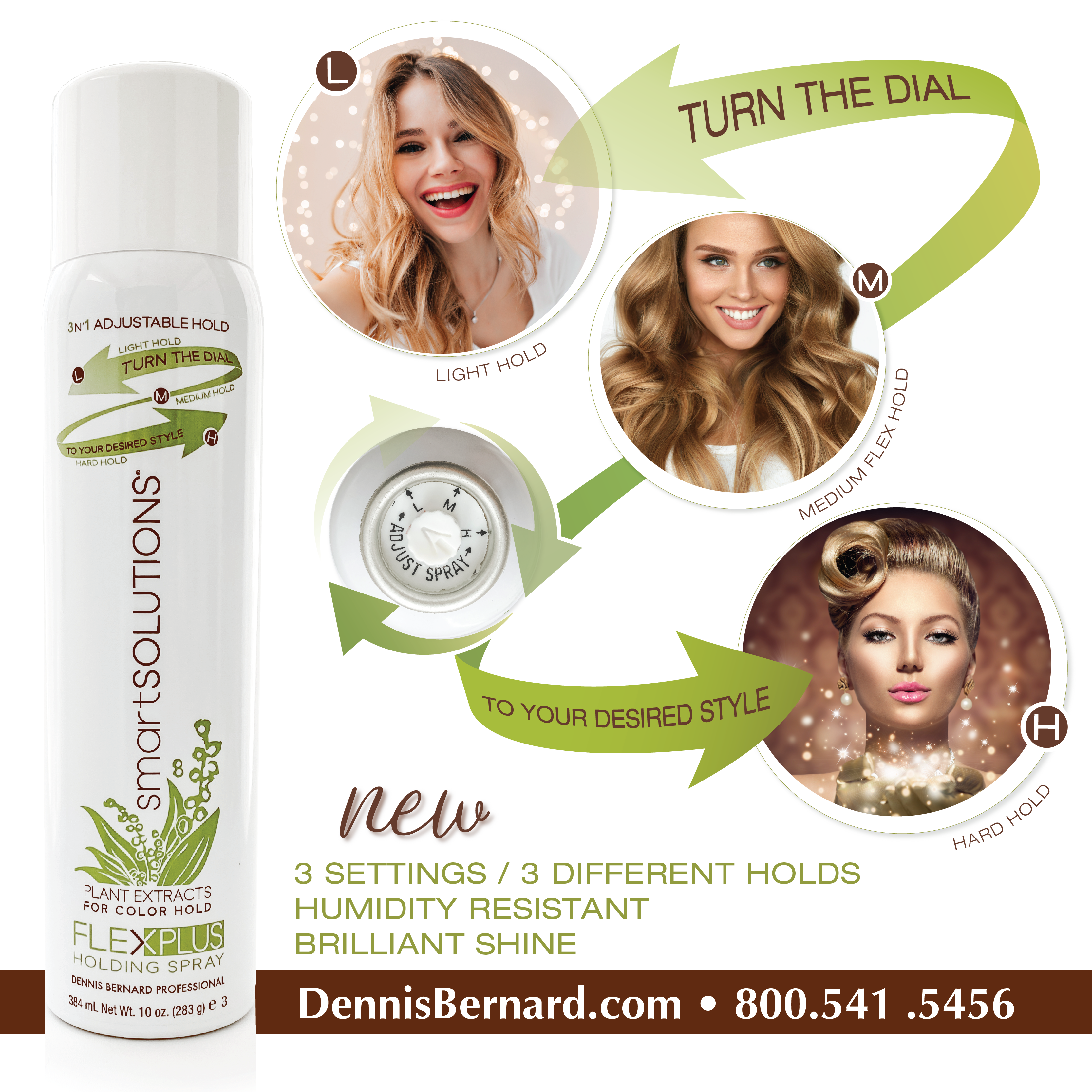 SmartSOLUTIONS FlexPlus Holding Spray (FPS), a professional working formula, features a first of its kind actuator that controls the amount of product dispensed just by ‘ TURNING THE DIAL TO YOUR DESIRED STYLE’. Customize the perfect style by selecting one of the three levels of hold: Light, for the beach wave look or to prepare the hair for the use with hot tools. Medium and Hard, for a more flexible style and /or incredible hold. FHS + is perfect for maintaining Updos and Avant Garde looks for up to 24 hours. FHS + is a quick drying formula that is never sticky and finishes, with a brilliant shine. FHS + balances moisture levels preventing flyaways. frizz, and static. FHS + features a unique blend of Plant Extracts that protect and extend color hold.