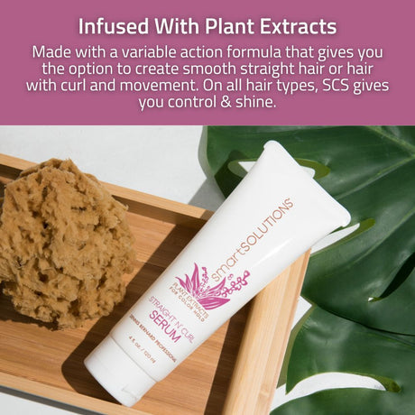 Straight N’ Curl Serum (SCS) variable action formula gives you the option to create smooth straight hair or hair with curl and movement. On all hair types, SCS gives you control & shine. It seals & strengthens the outer layer of the hair shaft (cuticle) reducing frizz and providing ultimate protection against the elements.