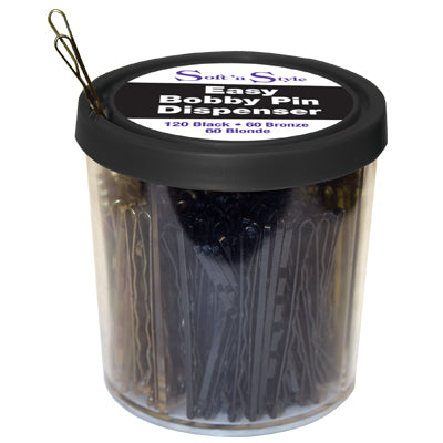 Easy Bobby Pin Dispenser comes filled with 120 black, 60 bronze, and 60 blonde 2" crimped ball-pointed bobby pins in a reusable container. Simply twist the top to desired pin color and shake pins into hand. Saves time and increases efficiency!