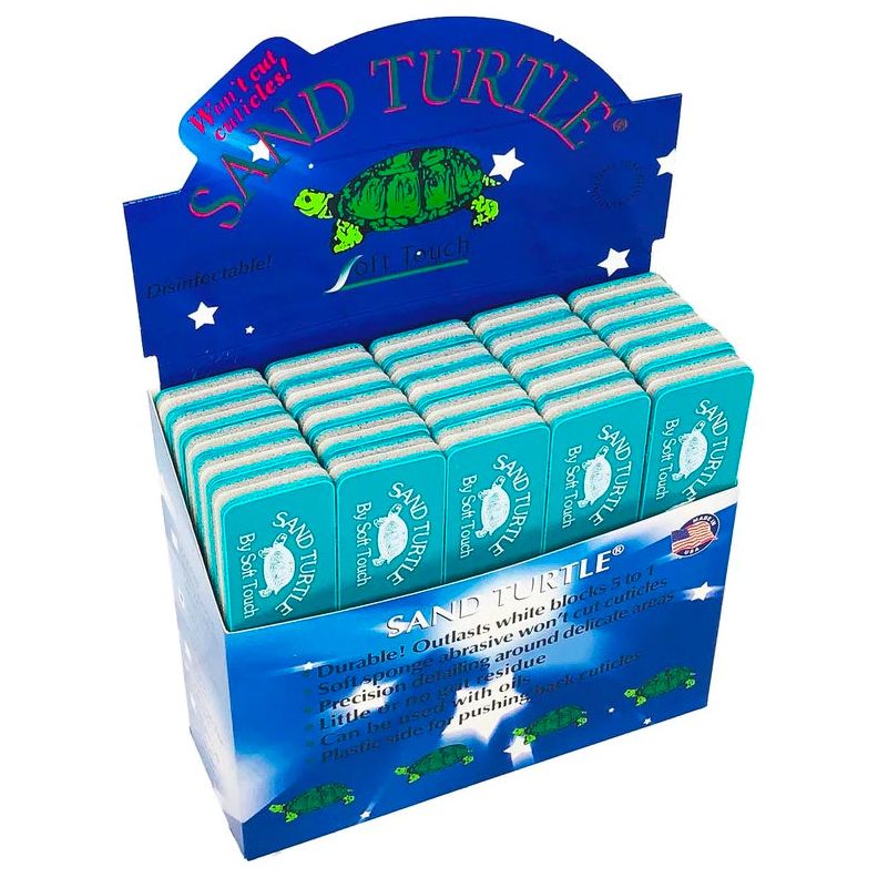 Our Sand Turtle® outlasts white blocks more than 5 to 1! •Soft sponge abrasive won't cut cuticles •Little or no grit residue •Disinfectable™ and can be used with oils •Great for detailing delicate areas