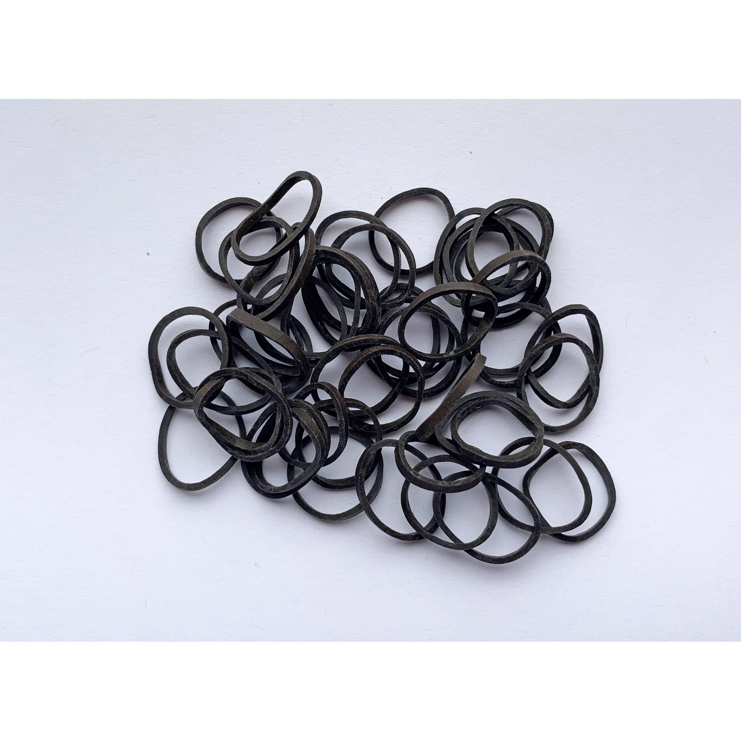 Assorted size rubber bands, 250 per bag. Available in assorted colors (assorted size), black (2 cm), and brown (2 cm). Made in the USA.
