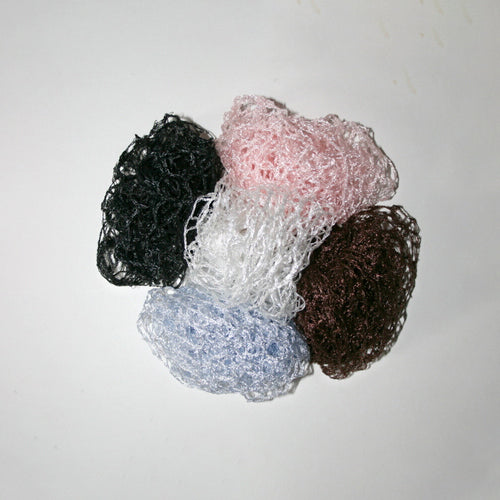 ¾” hexagon heavy mesh rayon wave net in a polybag. The bag has a hole for hanging. Available in black, blue, brown, pink, and white.