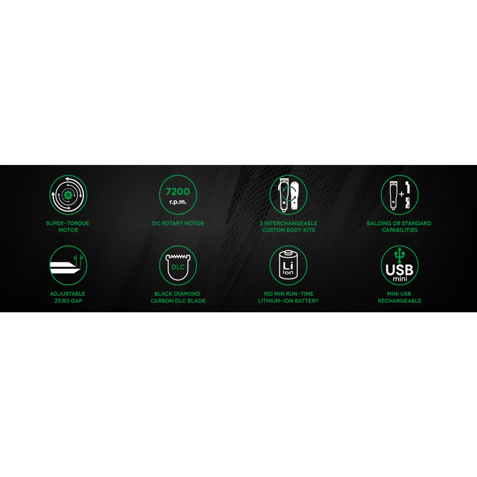 INCLUDES: 1 Year warranty, Balding Clipper, Double Black Diamond Carbon DLC Skin balding blade, Deep Slim moving blade, 5 black guard attachments (1/16”, 1/8”, 1/4”, 3/8”, 1/2”), micro-USB cord, charging stand, maintenance kit.