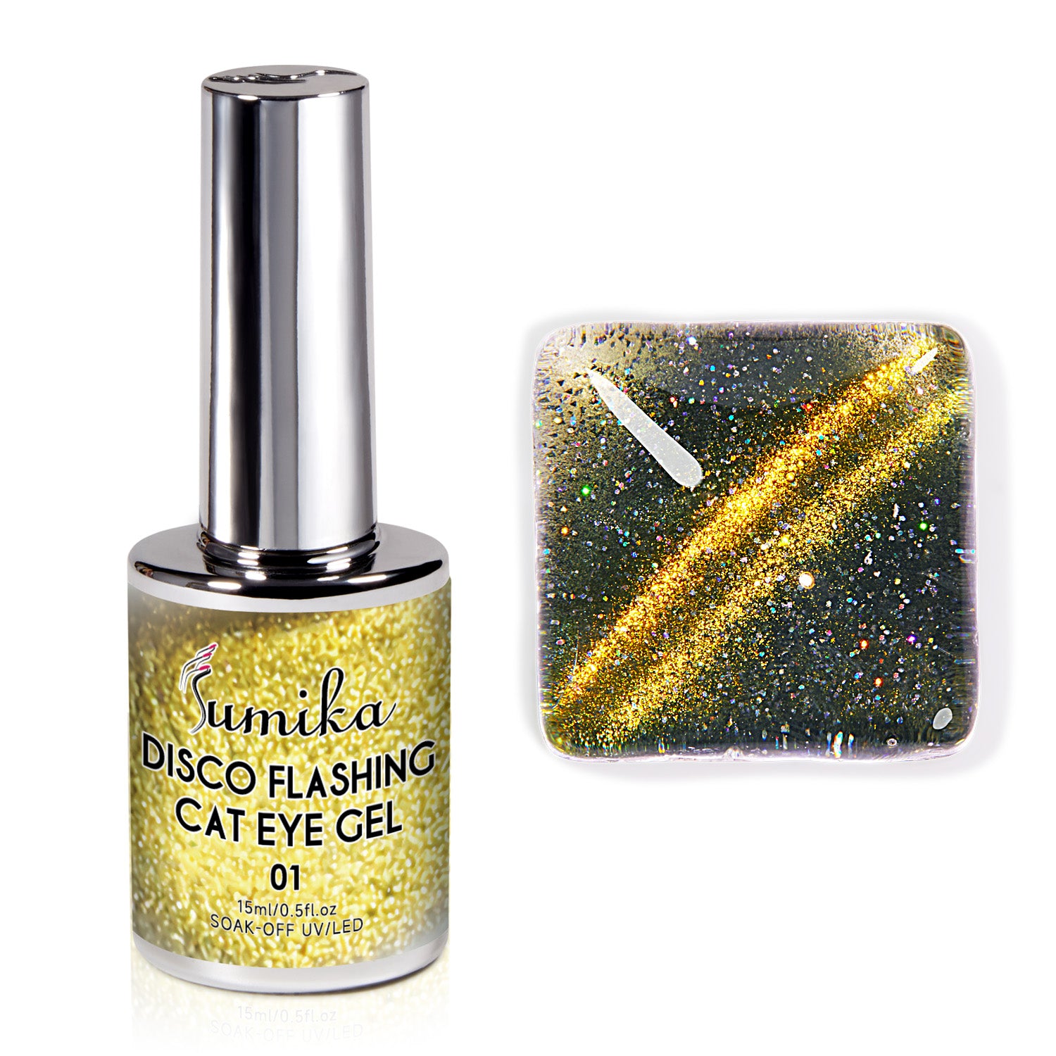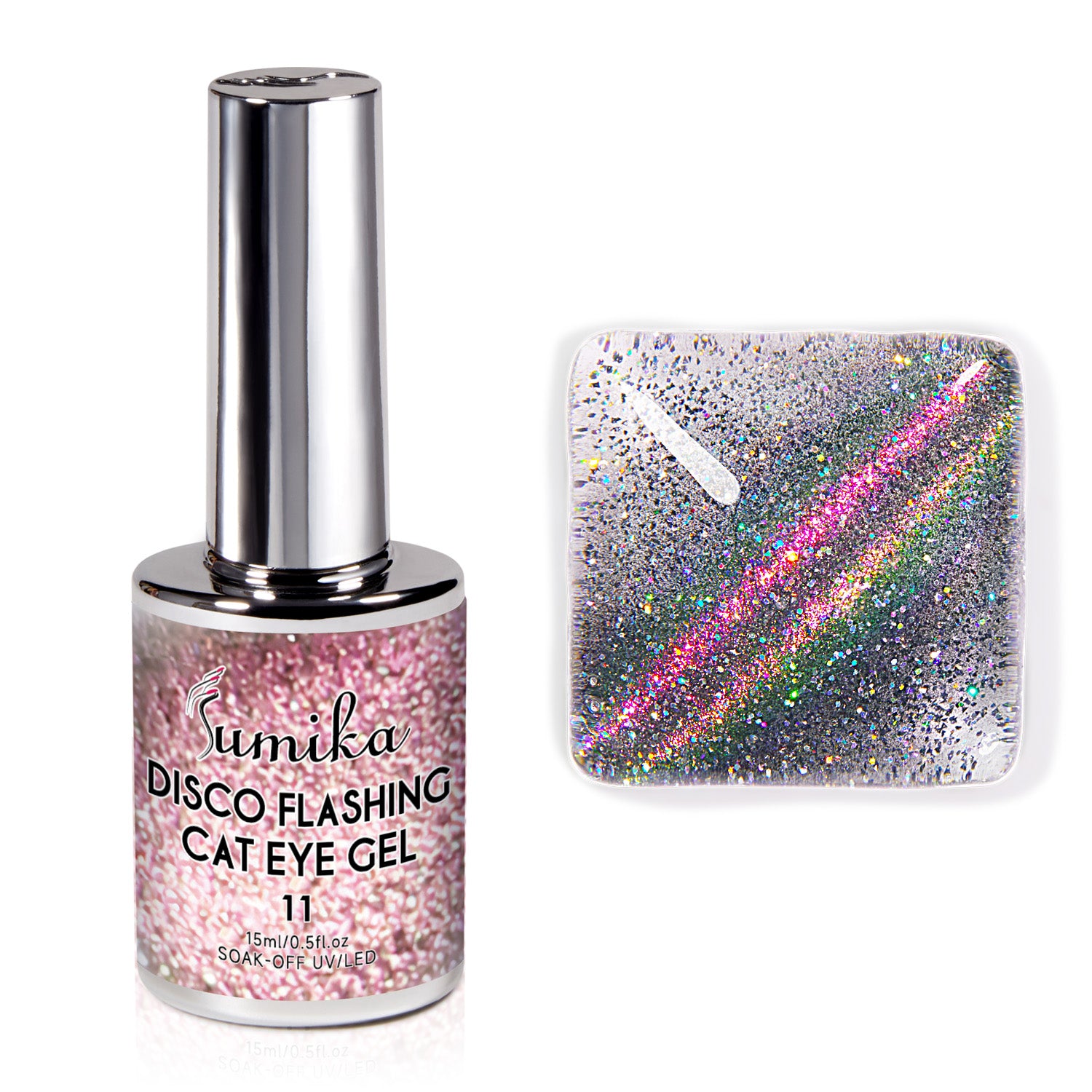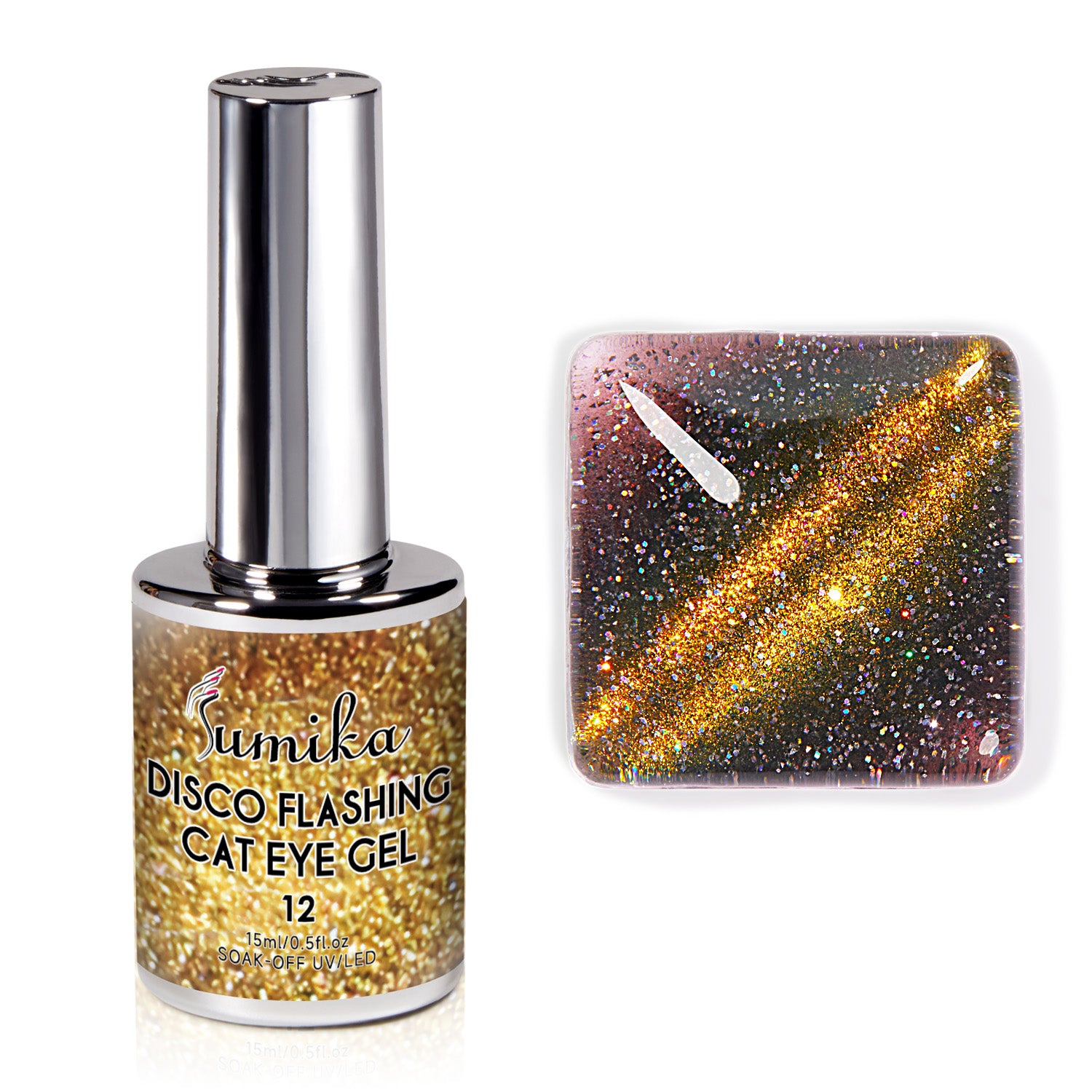 Sumika Disco Flashing Cateye Gel Whole Set Collection Contains:+ 12 Colors of Disco Flashing Cat-eye Gel (15ml-0.5 fl.oz/each)+1 bottle of Gel Base Coat (15ml-0.5 fl.oz)+1 bottle of Gel Top Coat (15ml-0.5 fl.oz)+ 1 color chart + Magnet