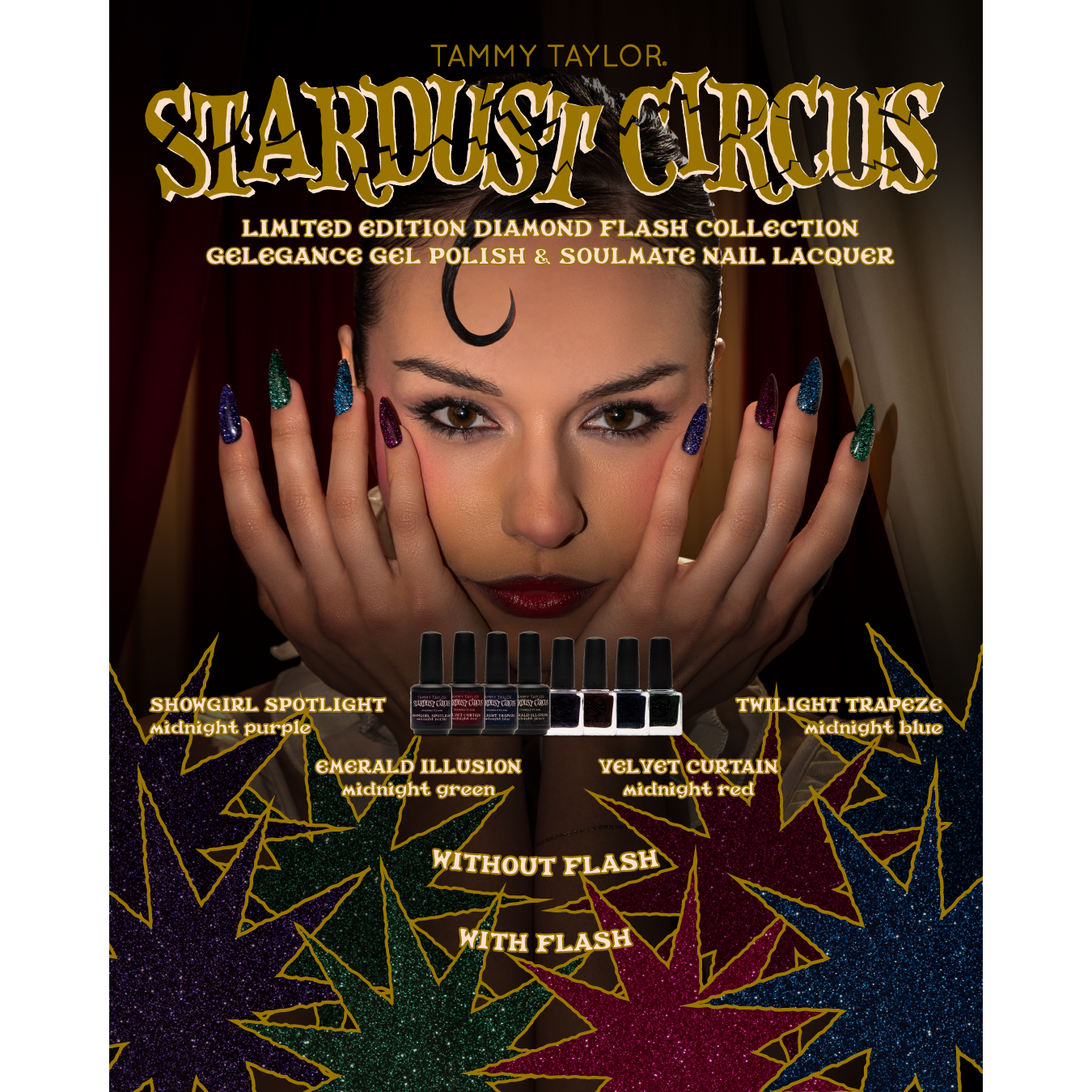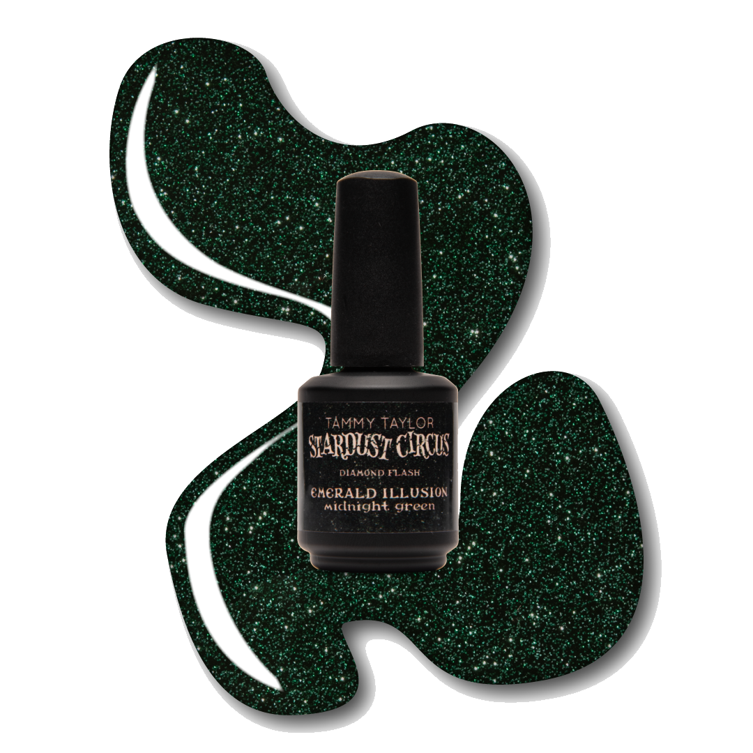 Emerald Illusion: A midnight green. Introducing the Stardust Circus Collection: Diamond Flash Gelegance Gel Polish The Diamond Flash colors are like having two colors in one bottle, without flash it is a deeper color with diamond shimmer, with flash it is a brighter color with intense diamond sparkle! Gelegance Gel Polish: Our premium soak-off gel polish delivers: Up to 3 weeks of wear Glass-smooth, high-shine finish No chipping, peeling, cracking, or lifting Non-damaging formula that doesn't wrinkle or shrink during curing Easy application for all skill levels Solvent-Free, Vegan, Cruelty-Free, Small-Batch Made in the USA Requires UV/LED lamp (60s LED...