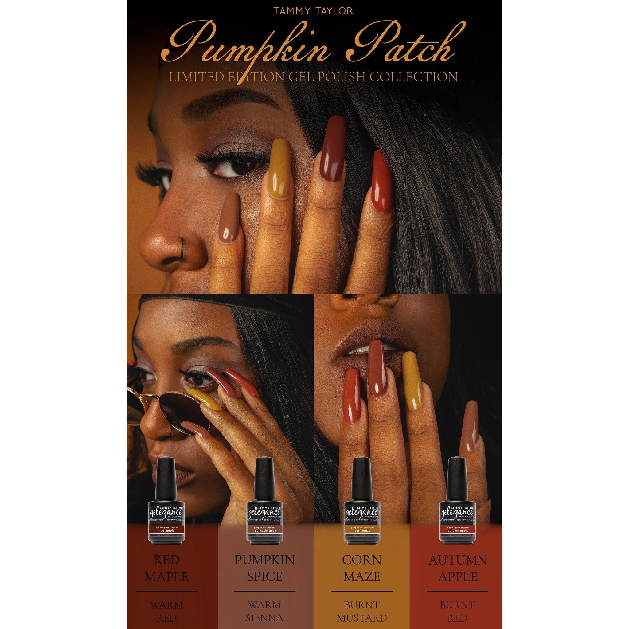 Pumpkin Spice is a warm sienna. Back for a Limited Time! The Pumpkin Patch Collection, a limited edition line of Gelegance Gel Polish that is perfect for the upcoming Season. Featuring four creamy fall shades — Autumn Apple (burnt red), Red Maple (warm red), Corn Maze (burnt mustard) & Pumpkin Spice (warm sienna). With rich pigments and long-lasting wear, Pumpkin Patch is your go-to. Each shade offers full, creamy coverage and is formulated to complement every skin tone. Gelegance Gel Polish: Our premium soak-off gel polish delivers: Up to 3 weeks of wear Glass-smooth, high-shine finish No chipping, peeling, cracking, or lifting Non-damaging...