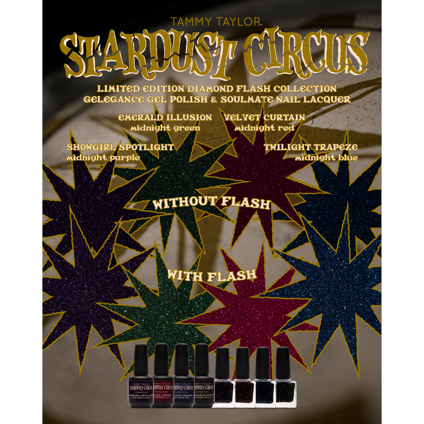 Velvet Curtain: A midnight red. Introducing the Stardust Circus Collection: Diamond Flash Gelegance Gel Polish The Diamond Flash colors are like having two colors in one bottle, without flash it is a deeper color with diamond shimmer, with flash it is a brighter color with intense diamond sparkle! Gelegance Gel Polish: Our premium soak-off gel polish delivers: Up to 3 weeks of wear Glass-smooth, high-shine finish No chipping, peeling, cracking, or lifting Non-damaging formula that doesn't wrinkle or shrink during curing Easy application for all skill levels Solvent-Free, Vegan, Cruelty-Free, Small-Batch Made in the USA Requires UV/LED lamp (60s LED...