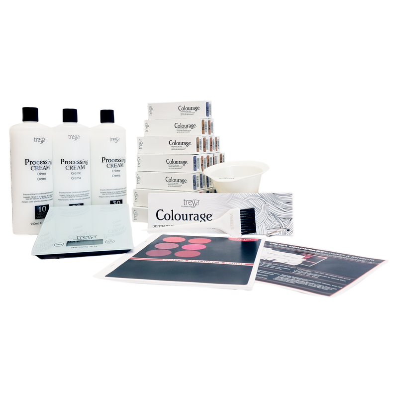 Kit includes the 30 top selling colors- 12N, 10N, 9N, 8N, 7N, 6N, 5N, 4N, 3N, 1N, 9G, 8G, 7G, 6G, 5G, 12A, 10A, 9A, 8A, 7A, 6A, 5A, 4A, 8AA, 7AA, 6AA, 7R, 6R, 5R, and 4RM. Three Processing Creams (10, 20 and 30 volume), a swatch ring, scale, bowl, brush, tube key and color literature.