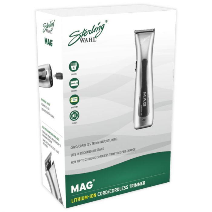 The Sterling Mag Trimmer gives you the convenient feature of both cord and cordless use and is powered by a lithium ion battery for a 2 hour run time. The snap on blades provide high precision accuracy for a clean line and cut and are easy to clean and maintain. Made in the U.S.A., this lightweight rechargeable trimmer is a stylists dream! Lithium-Ion Cord/cordless trimmer with quick-detach blade Up to 2 hours cordless trim time per charge Lightweight, easy to use Ultra-Quiet, perfect for children More Information Accessories 4 attachment combs (1/8" - 1/2"), recharge stand, oil, cleaning brush, instructions...